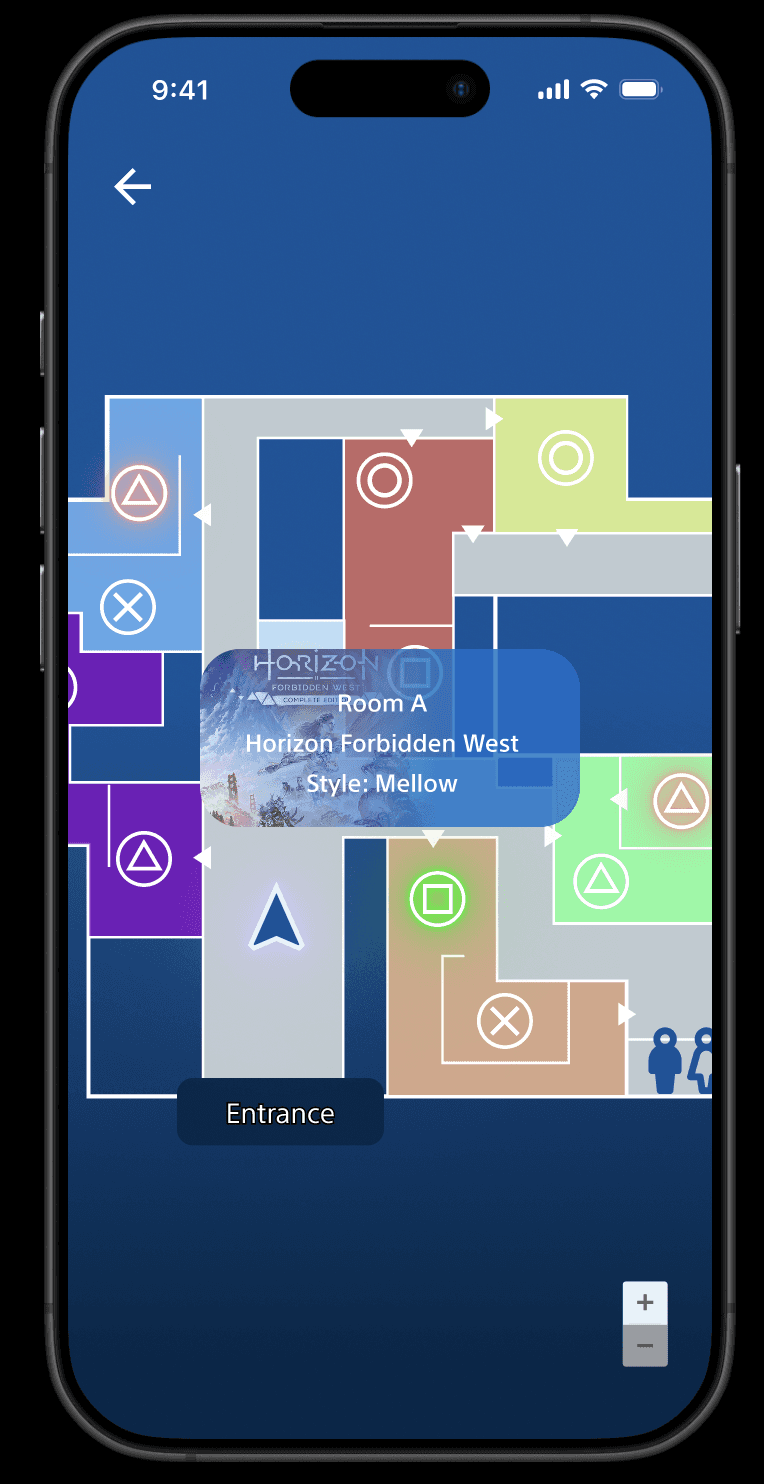 Visitors walk through themed rooms with varied audio, seating, and game videos on screens