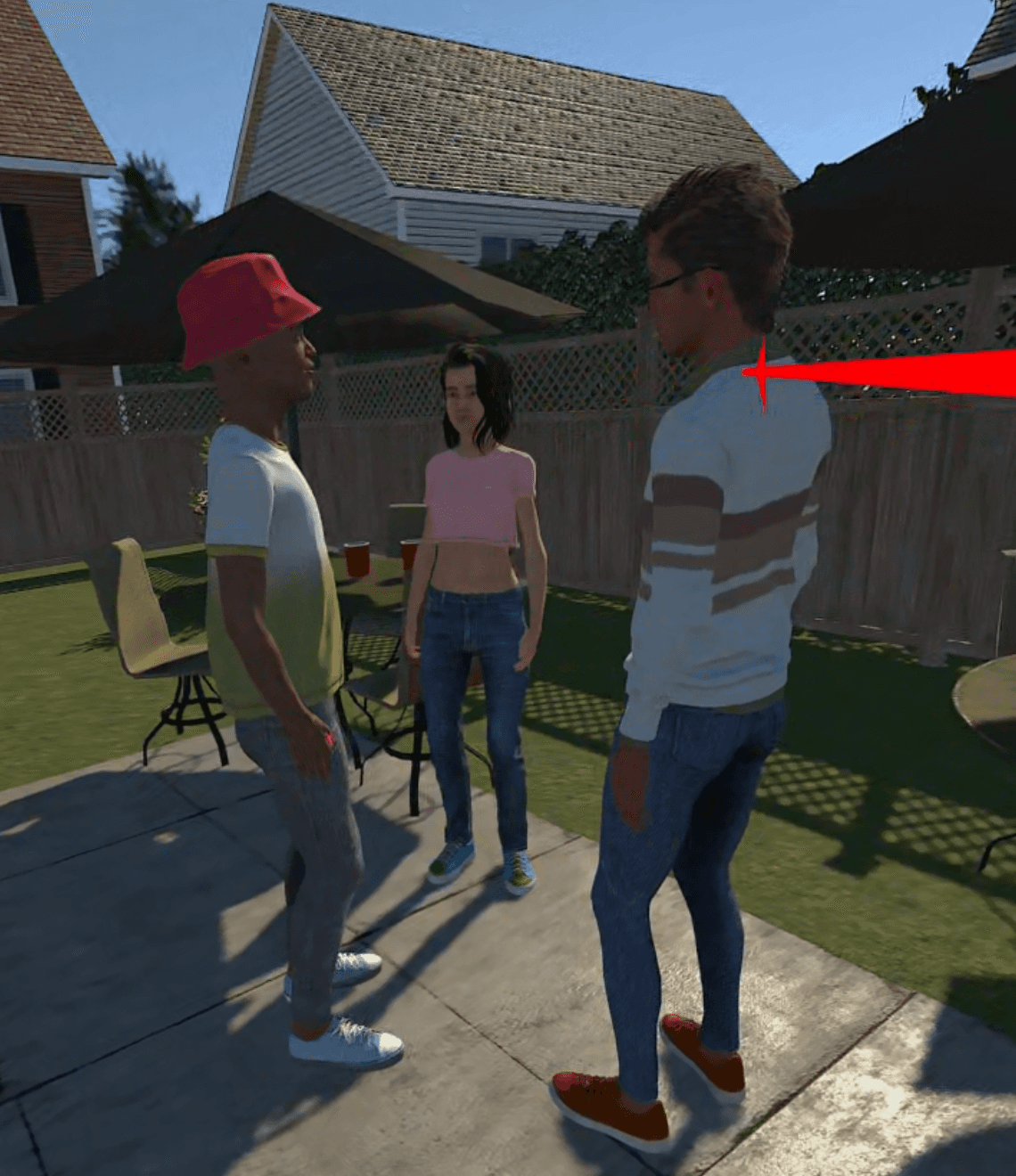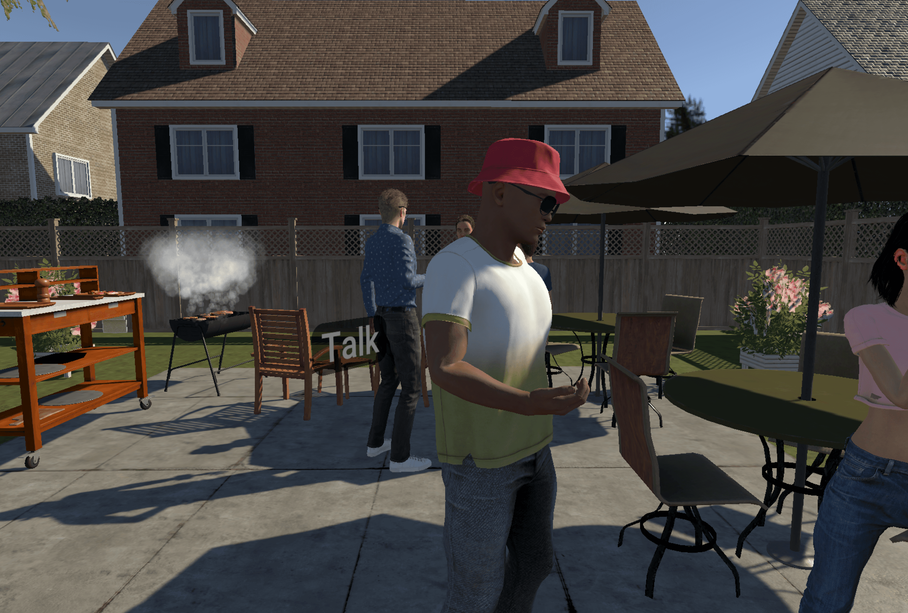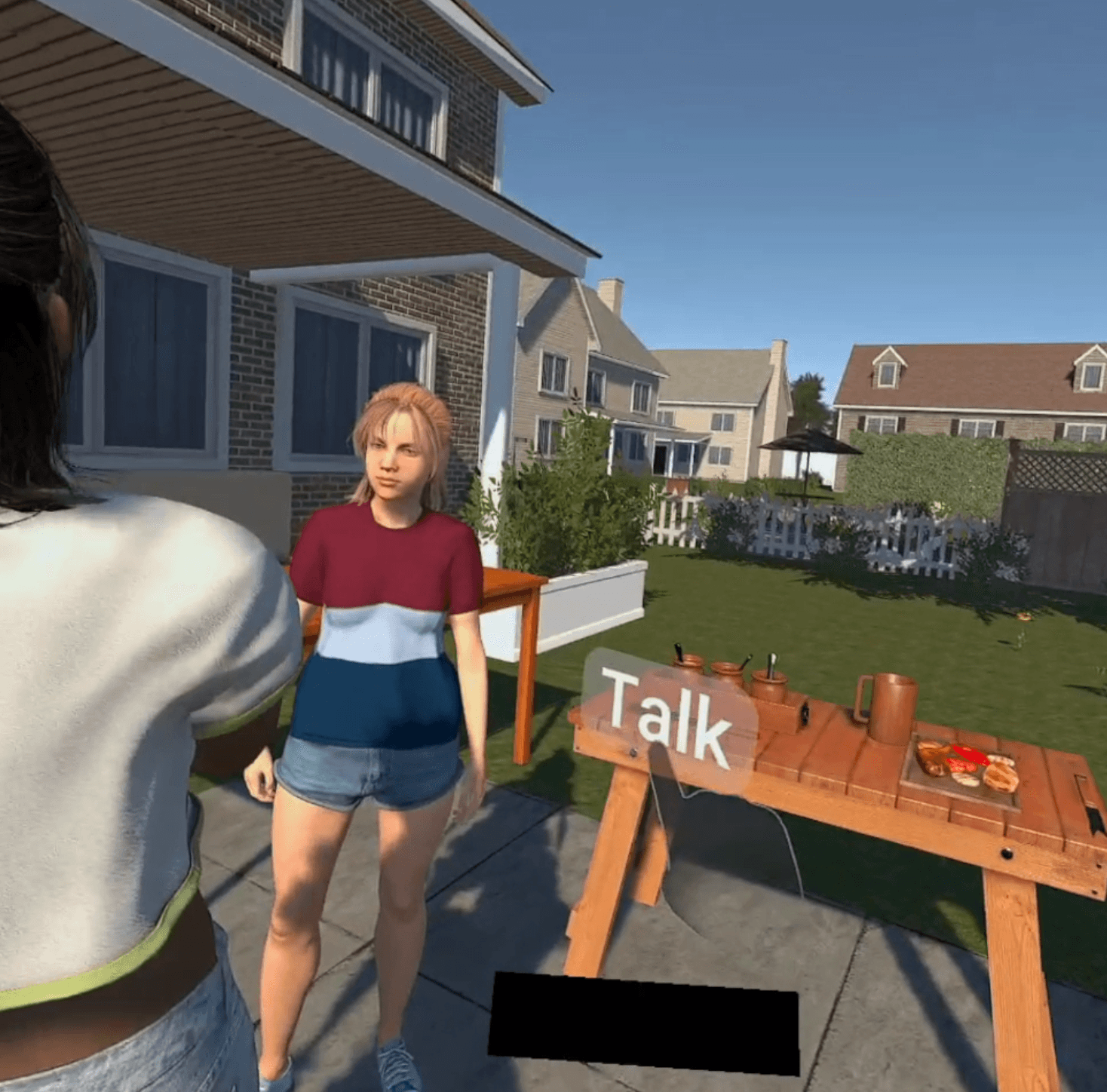 Proximity-based character interactions were developed to simulate social realism; virtual characters can be spoken to once interacted with, and dynamic spatial audio was developed to convey ambient social cues.