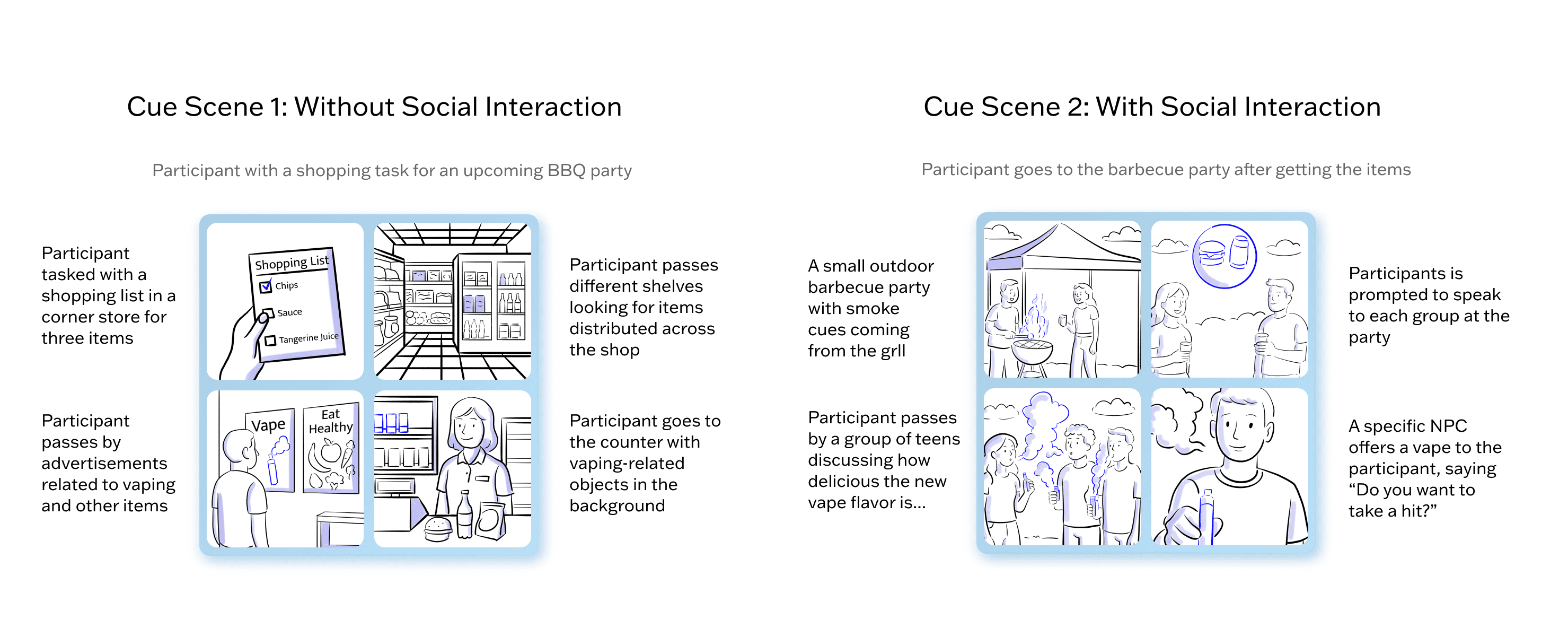 The user switches between two scenes, one social and one non-social, each with their unique flows and mechanisms to draw eye gaze and induce vaping-related cues.